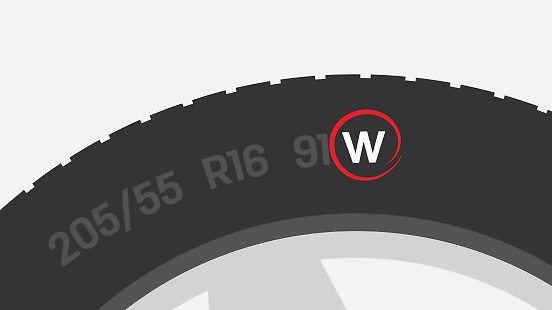 The speed rating is displayed on the tyre’s sidewall, after the load rating. In this example, the car’s speed rating is W, which indicates that it has been legally approved for use up to 270km/h.